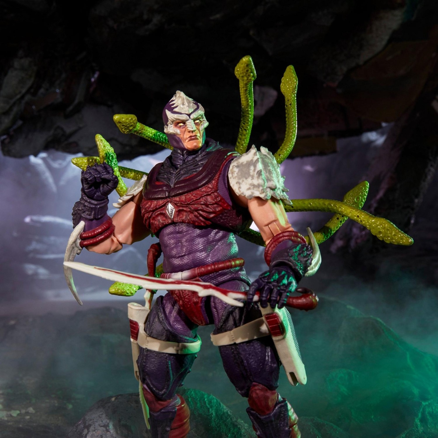 The dark, glossy purples and muted reds contrast well against his bone-like armor plating. Dry brushing adds depth to his monstrous form, and subtle washes in the musculature make it feel less like plastic and more like living tissue. Some collectors have noted minor QC issues with paint applications, particularly around the eyes and mouth. If you’re a stickler for perfect paint apps, this might warrant an in-person hunt rather than an online purchase.